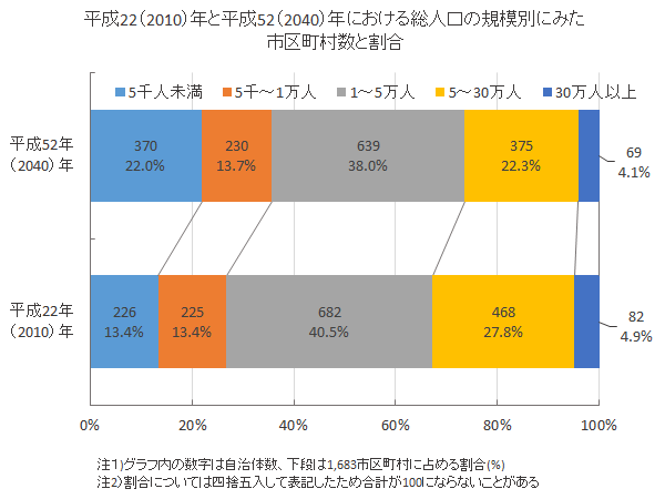 自治体数を規模別で見ると、2010年から2040年にかけて総人口5万人以上の自治体は550から444に減少する。一方、5万人未満の自治体は1,133から1,239に増加するとされている。特に、5千人未満の自治体の割合が上昇し、226から370へ1.6倍の増加となる。