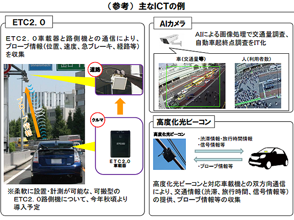 渋滞緩和の課題に対しては、渋滞が多く発生する観光地を中心に、ICT(情報技術)・AI(人工知能)を活用した渋滞対策の実験を実施する動きもあらわれている。AIカメラによる交通量調査や従来のETCに渋滞回避支援や安全運転支援の機能が付加された「ETC2.0」などが導入されている。将来的には、AIの分析や予測結果に基づいて人や車の流れを最適化、渋滞発生の予測データによって、信号制御や交通規制をすることも実現に向かっている。