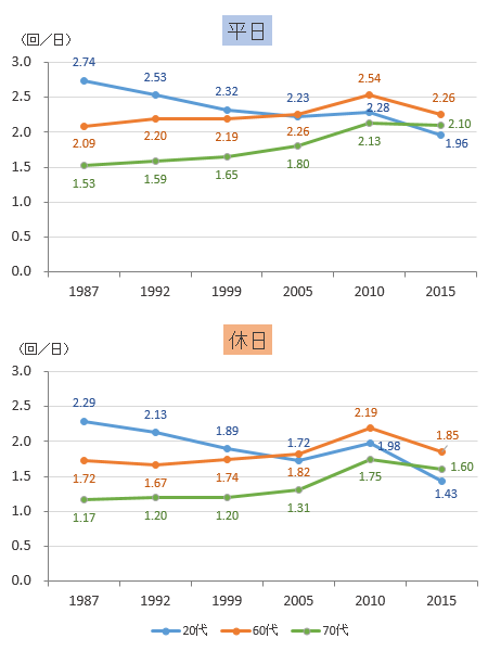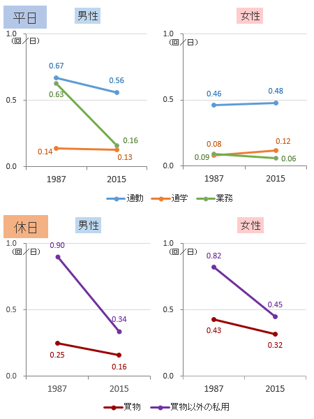 最も移動回数が多かったのは50代で、平日で2.37回であった。40代も50代のほぼ同等の2.36回と、移動回数が最も多いのは40代から50代のようだ。以降、高齢になるにつれ移動回数は減少傾向となる。経年で比較すると、1987年に20代の移動回数は平日で2.74回であったが2015年には1.96回まで減少。60代・70代はこれとは逆に、増加傾向にある。特に70代は、平日の移動回数が1.53回から2.10回と、大きく増加している。