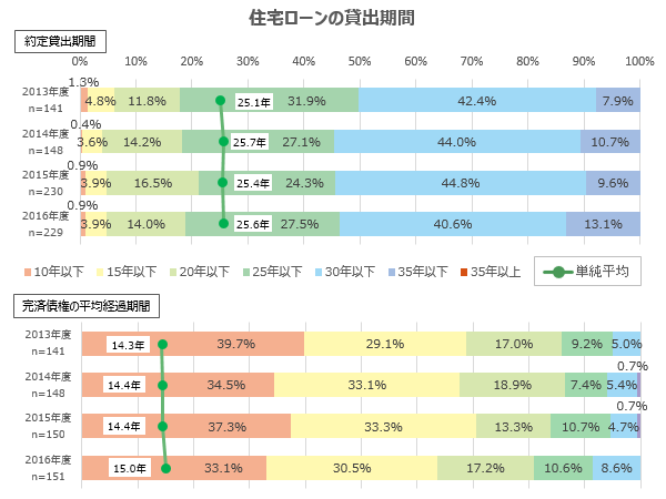 では、住宅ローンを借りた人の、当初の貸出期間はどのくらいなのだろうか。約定貸出期間を見てみると、2016年度の平均は「25.6年」と2015年度の「25.4年」と比べてほぼ横ばいとなっており、最も割合の多い「21年以上25年以下」は、2015年度から27.5%と3.2%増加している。また、2015年度と比較して最も上昇率が高かったのは「31年以上35年以下」(13.1%)で、昨年から3.5%増加している。