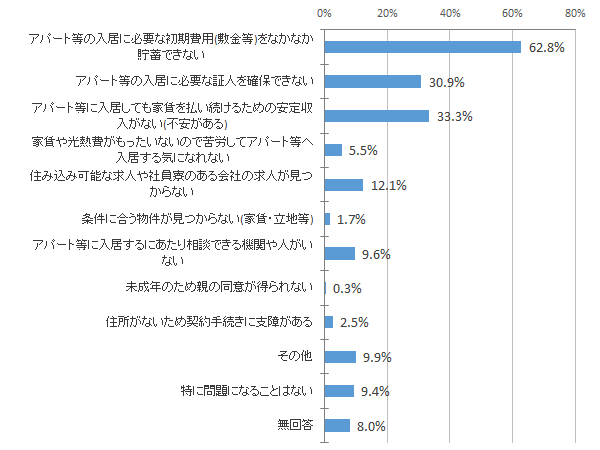 調査では、住居を確保するにあたっての問題点についても聞いている。現在、住居を確保することについて「住居を確保したいが、具体的な活動・努力(貯蓄など)はしていない」と回答した人が最も多く47.4%、「住居を確保したいと思わない」という人も24.5%いる。だが、問題点として「住居入居初期費用(敷金等)の貯蓄の難しさ」と回答する人が62.8%と最も多く、次に「住居入居後に家賃を払い続けられる安定収入がない」が33.3%、「入居保証人の確保の難しさ」30.9%と続く。