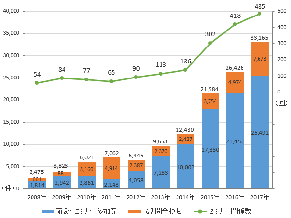 発表によれば、センターへの来訪者・問合せ数は昨年より大幅に増加。2016年の2万6,426件から、2017年は33,165件と26%増加、3万件を突破した。背景には、地方移住促進に積極的な自治体の増加があるようだ。移住相談会やセミナーは、昨年の418回から485回に増加。東京交通会館で開催されるセンターとの共催イベントでは、500人を超える来場がある人気の県もあるようだ。自治体が移住促進に積極的に取り組んでいる状況が窺える。