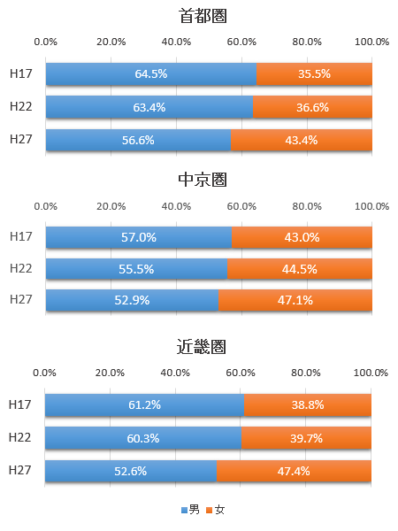 鉄道の定期券利用者を属性別に見ると、前回調査と比較して女性の乗車人員が全圏域で増加。男性の定期券利用者は首都圏、近畿圏で減少、中京圏では横ばいという結果となった。男女別で定期券利用者の構成比を見ると、調査ごとに女性の割合が増加している。2015年で女性の割合が首都圏43%、中京圏で47%、近畿圏が47%となっており、年々男女差が少なくなってきていることが分かる。