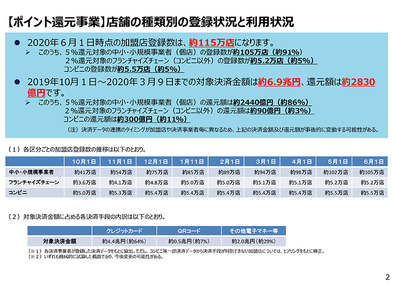 2020年6月1日、経済産業省はキャッシュレス・ポイント還元事業に関する直近の状況を公表した。登録加盟店数は、2020年6月1日時点で約115万店。開始当初の10月での加盟店舗数約50万店舗から倍以上に増えたこととなる。店舗の内訳は、5%還元対象の中小・小規模事業者(個店)の登録数が約105万店(約91%)、2%還元対象のフランチャイズチェーン(コンビニ以外)の登録数が約5.2万店(約5%)、コンビニの登録数が約5.5万店(約5%)であった。