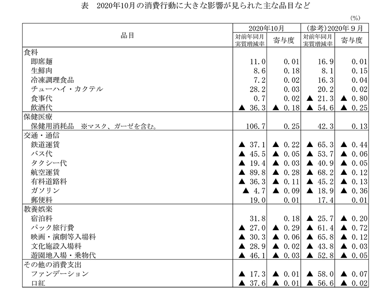 2020年10月の消費行動に大きな影響が見られた主な品目では、食料のうち特に即席麺が対前年同月実質増減率11.0%、チューハイ・カクテルが28.2%と大きく伸びている。マスクやガーゼを含む保健用消耗品は106.7%増加と、9月の42.3%増と比較しても増加幅が大きい。
