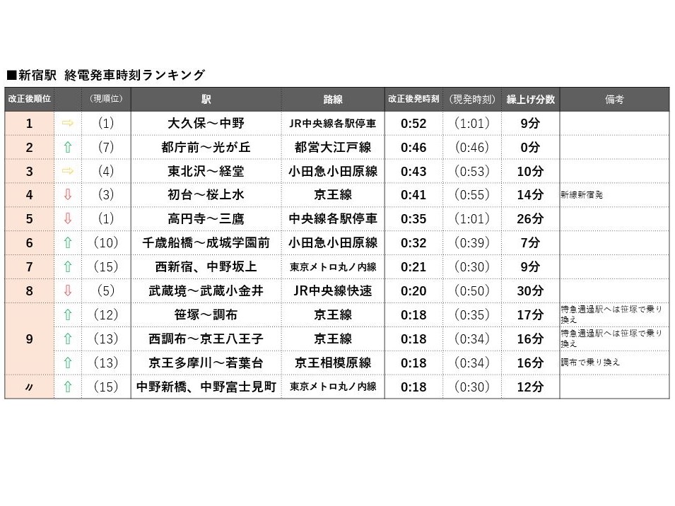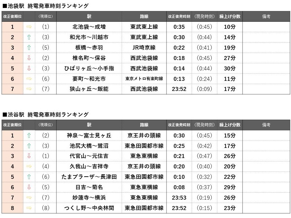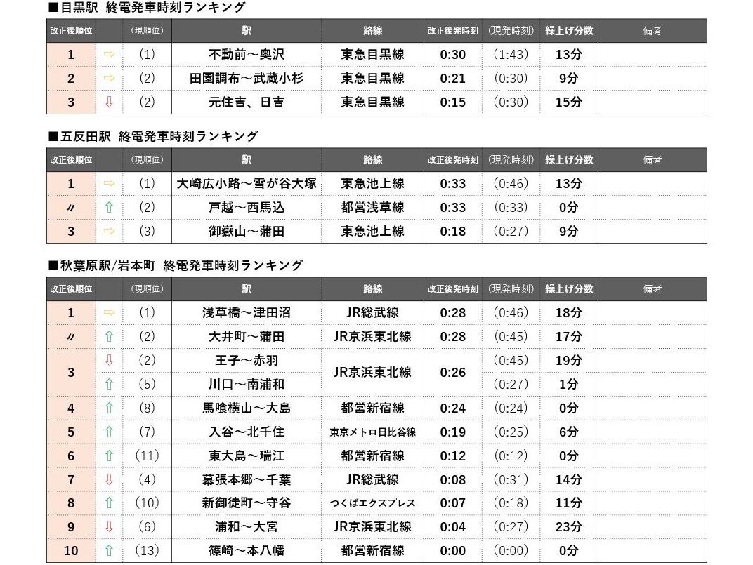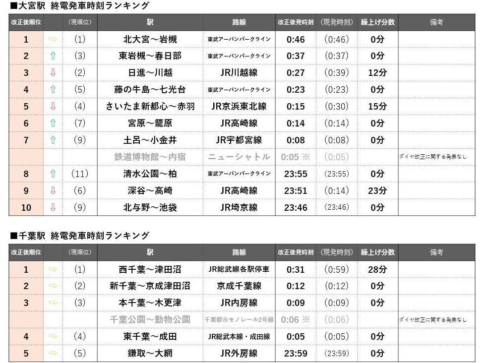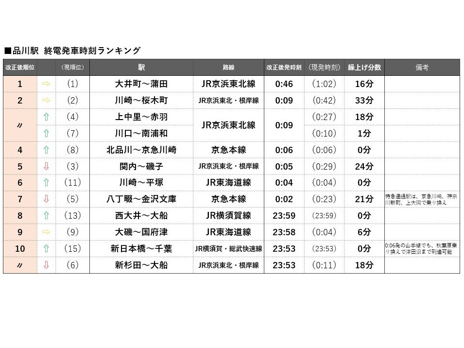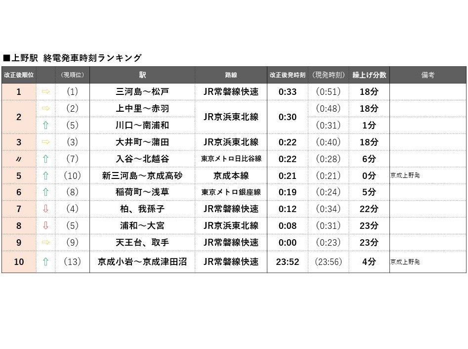 上野駅はJR常磐線快速松戸行が1位を維持するものの、上野発車が20分以上繰り上がるのはJR常磐線沿線だけとなり、優位性が下がる。上野~東京~品川の各ターミナルを通るJR京浜東北線は南行・北行ともに遠距離ほど繰り上げ幅が大きく、南行の桜木町行は32分繰り上げ、北行の大宮行も23分繰り上げとなる。一方、北行の最終である上野行の1本前の列車(山手線外へ行く最後の列車)が、赤羽行から南浦和行に延長されることにより、両駅間の川口、西川口、蕨の3駅は実質1分の繰り上げにとどまり順位を上げた。コロナ禍での借りて住みたい街ランキングで順位を上げた西川口(20位→6位)と川口(32位→19位)にとっては終電時刻においても優位性を増すダイヤ改正となる。