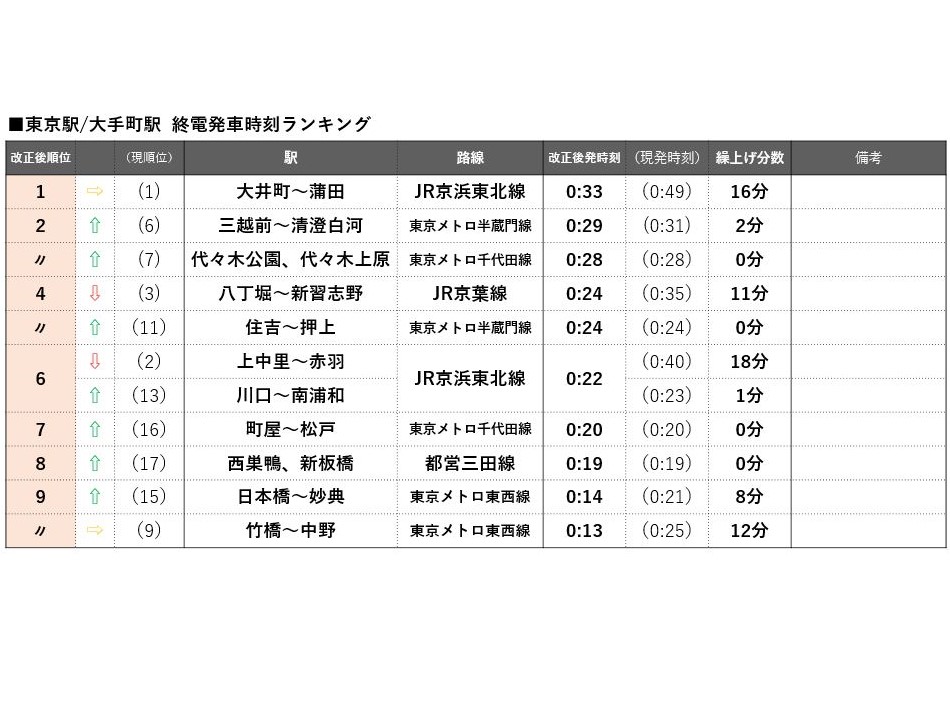東京駅・大手町駅からの終電時刻は、JR京浜東北線蒲田行が1位を維持。繰り上げ幅の小さい地下鉄沿線の都内各駅が上位を占める中で、JR線にしては繰り上げ幅の小さかったJR京葉線が4位と健闘。舞浜や新浦安を経て千葉県の新習志野まで達し異彩を放つ。JR線と比べて地下鉄各線は繰り上げ幅が小さいが、大手町から西に向かう東京メトロ半蔵門線と都営三田線は、直通先の東急線が大幅繰り上げ予定のため、両線の最終列車とも東急線との直通・接続を行わなくなり、東京・大手町エリアから城西方面へ到達する列車の発車時刻は大幅に早まる。城東方面の玄関口を担う東京・大手町エリアでは、これまで武蔵小金井や鷺沼、奥沢といった城西方面へも城東方面とほぼ同時刻まで終電が確保されていたが、今回の中央線と東急線の大幅繰り上げによって東西で終電格差が生じそうだ。