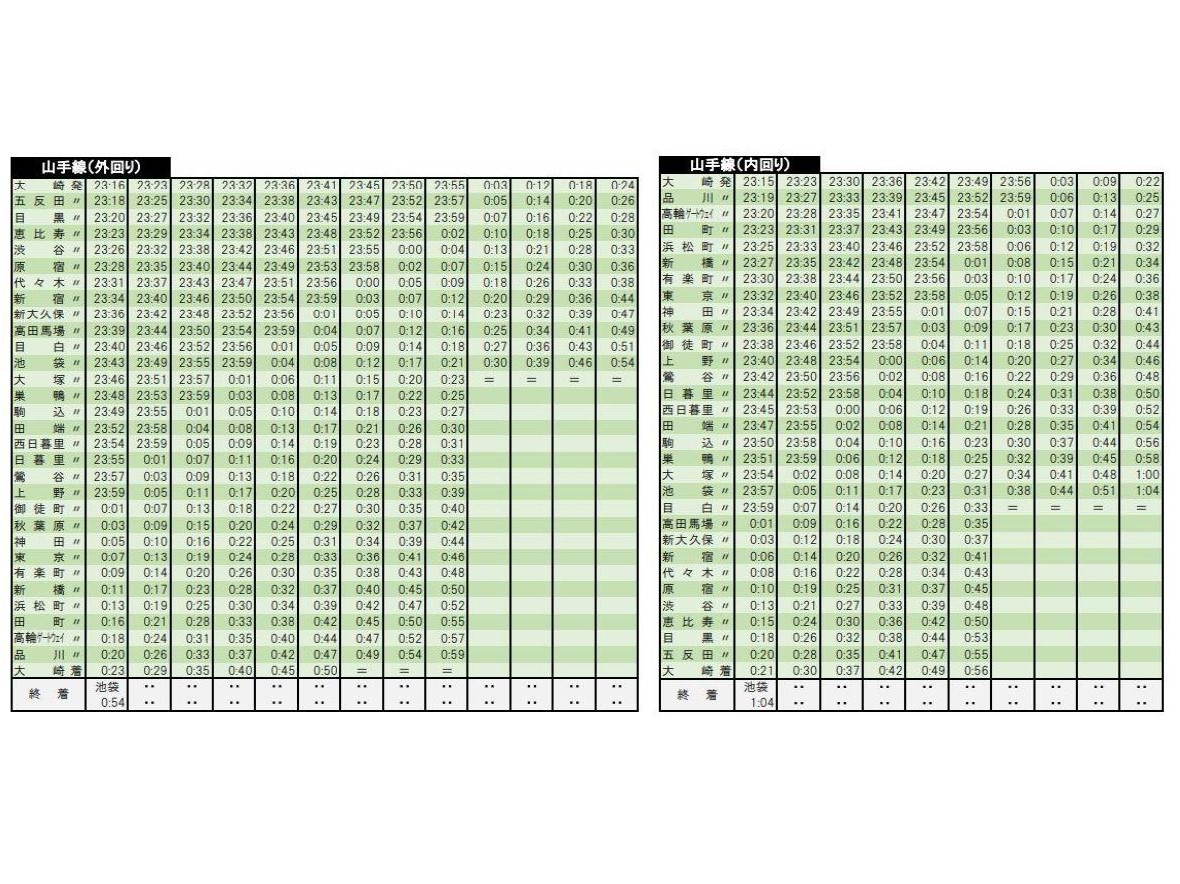 終電付近の深夜時間帯で利用が最も減っているのはJR山手線で、0時台は約40%減少している。3月13日のダイヤ改正以降は、外回りで各駅16~19分繰り上げ、内回りは上野、東京、品川こそほぼ現行どおりだが、池袋、新宿、渋谷では19分の繰り上げとなる。本項下部にJR山手線の改正予定時刻を掲載しているので、ランキングと併せて各終電に乗り換えが可能な列車を確認いただきたい。
