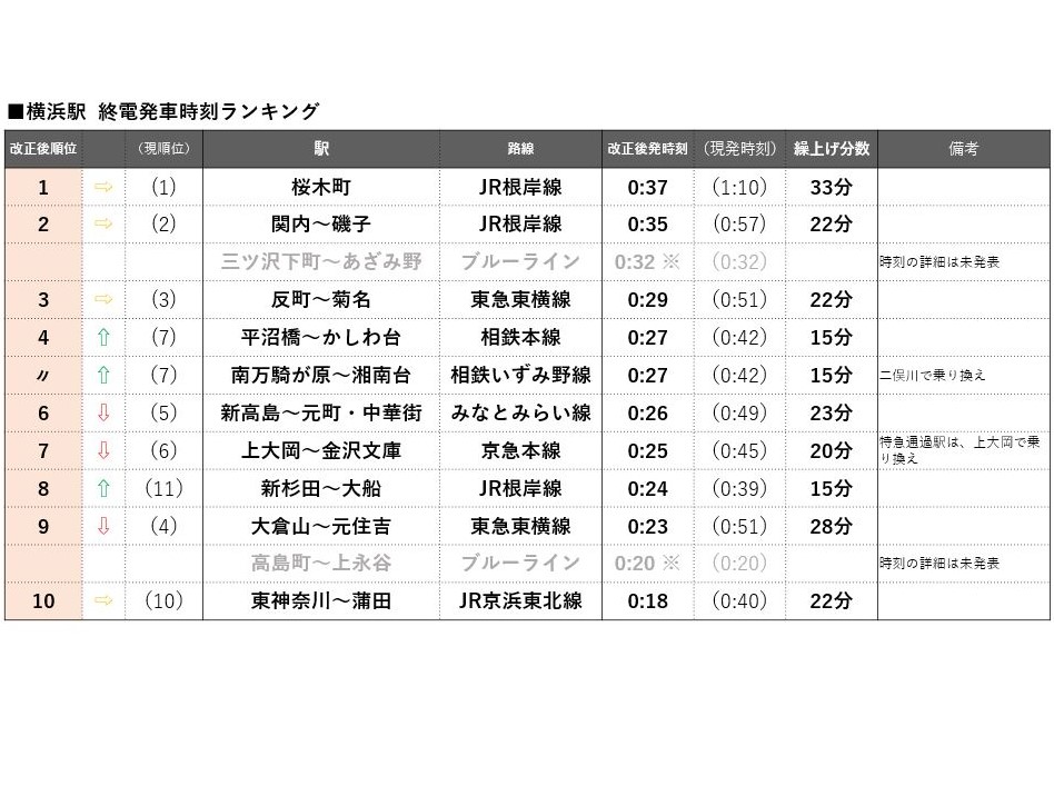 平日ダイヤで、各駅に到達する列車の発車時刻が遅い順。なお、山手線内の駅は除外。2021年春以降のダイヤについて発表のない横浜市交通局、ニューシャトル、千葉都市モノレールはランキングから除外し、参考として記載。