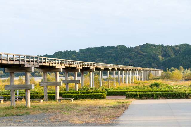 それ以外にも日本一、いや世界一長い木造歩道橋と認定された蓬莱橋もある。島田市の蓬莱橋は1879年に牧之原台地の開墾のために架けられた。長さは897.4メートル、その長さに由来して、「やくなし8974」-厄が無いや、「長い木の橋」-長生きの橋などとも呼ばれご利益がありそうなスポットでもある。1997年に「木造歩道橋として世界一の長さ」であるとギネスに認定された。