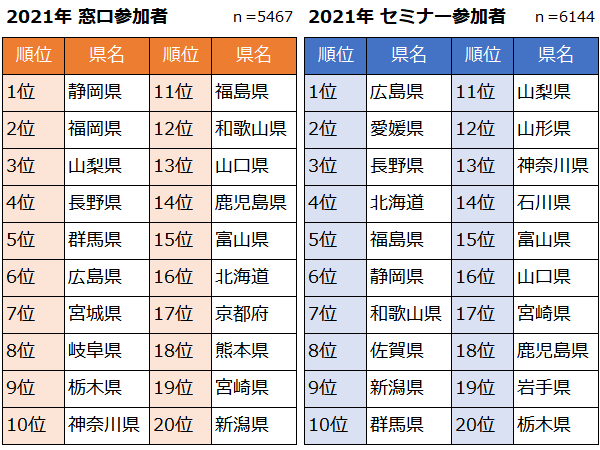 さて、ランキングの結果だが、2020年と同様に新型コロナウイルス感染症の影響でオンライン形式でのセミナーが多かったことで、窓口での相談者とセミナー参加者を分けて発表している。