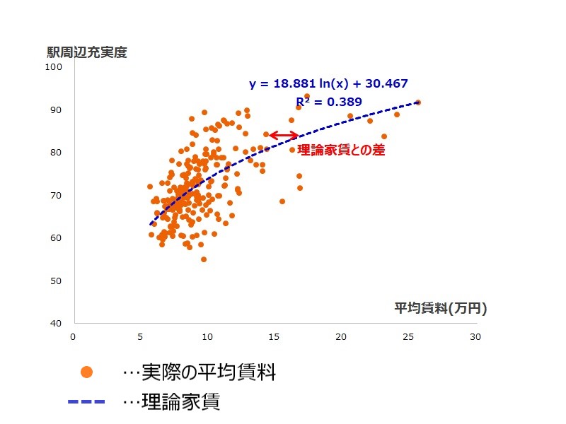 本ランキングでは、「駅周辺の施設充実度が高い」ことを「住みやすい」と定義し、対象駅周辺の充実度から算出した「理論家賃」に対し、実際の平均賃料がどのくらいかを割合で示したもの(理論家賃比率)を集計、理論家賃に比べ実際の平均賃料がより安い駅のランキング化を行った。