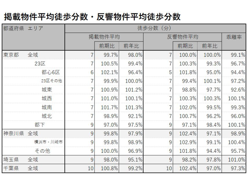 駅からの反響物件平均徒歩分数については、全体的に短縮傾向が見られた。短縮が大きかったエリアとしては、都心6区が前年比95.0%、神奈川県の横浜市・川崎市を除くエリアが同94.4%だった。