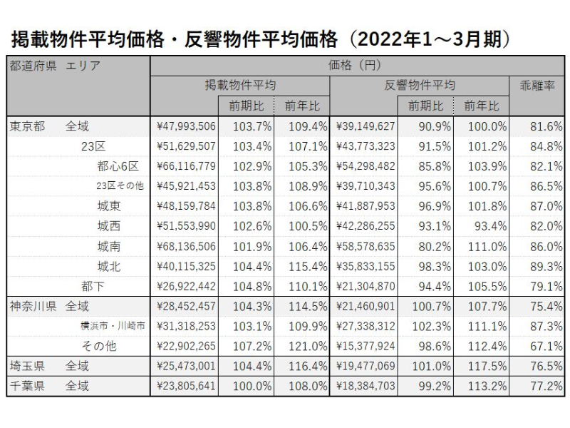 2022年1~3月期の掲載物件平均価格は、東京都が4,799万3,506円で前年比109.4%、神奈川県が2,845万2,457円で同114.5%、埼玉県が2,547万3,001円で同116.4%、千葉県が2,380万5,641円で同108.0%と、1都3県では前年比で8~16%の上昇が見られた。