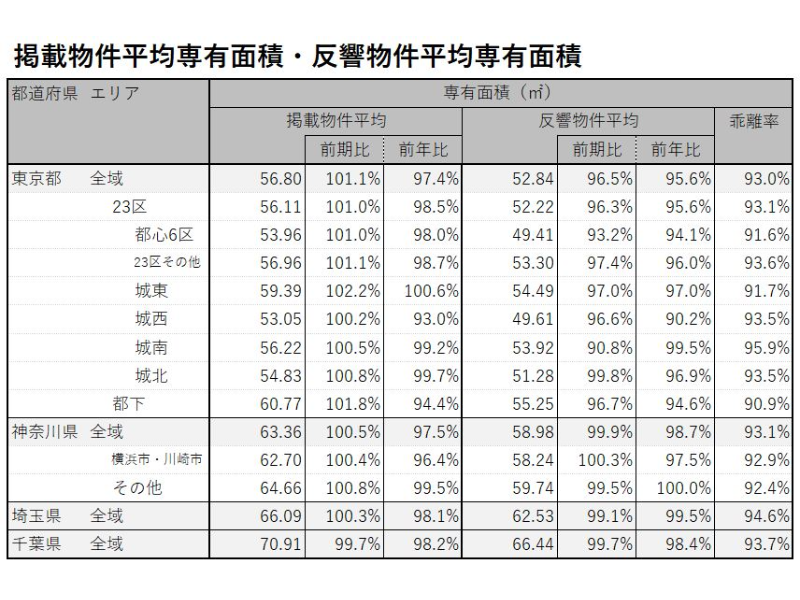 都道府県別に反響物件平均専有面積と、掲載物件平均専有面積との乖離率を見ると、東京都が52.84m2で乖離率93.0%、神奈川県が58.98m2で乖離率93.1%、埼玉県が62.53m2で乖離率94.6%、千葉県が66.44m2で乖離率93.7%と、全体的に乖離が見られた。