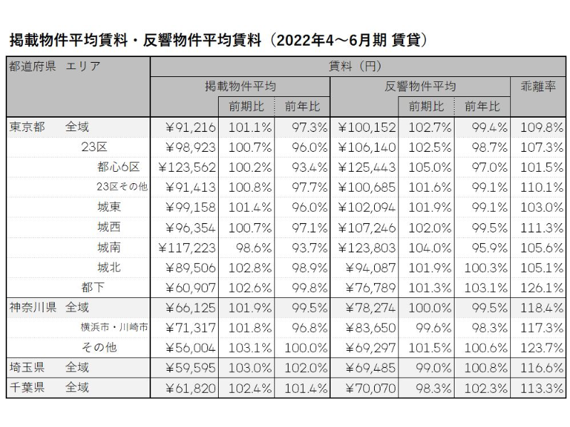 また、ユーザーが問合せをした物件(反響物件)の平均賃料は、東京都が10万152円で前期比102.7%、前年比99.4%、神奈川県が7万8,274円で前期比100.0%、前年比99.5%、埼玉県が6万9,485円で前期比99.0%、前年比100.8%、千葉県が7万70円で前期比98.3%、前年比102.3%となった。エリア別では東京都心6区が12万5,443円で前期比105.0%、城南が12万3,803円で同104.0%と、比較的賃料水準の高いエリアで上昇したが、前年比ではそれぞれ97.0%、95.9%と、いずれも前年の水準に達していない。なお、これらはおおむね掲載物件平均賃料と同様の動向である。