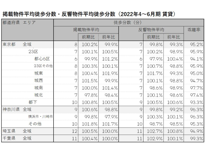 掲載物件平均徒歩分数は、1都3県いずれも前期比・前年比ともにほぼ横ばい。反響物件平均徒歩分数は、埼玉県が前期比102.7%、千葉県が102.9%とわずかに増加したものの、前年比ではほぼ横ばいとなった。