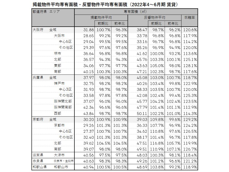 2府1県(大阪府、兵庫県、京都府)の掲載物件平均専有面積は、前期比98%台~100%台と、前の3ヶ月からおおむね横ばいだが、反響物件専有面積は、大阪府で前期比98.7%、兵庫県で同103.0%、京都府で同109.8%と、差が出ている。しかし、いずれも反響物件平均賃料の伸び率よりを上回っており、特に京都府北部では反響平均賃料が前期比103.9%に対し反響平均専有面積は同116.8%でその差は12.9ポイント、京都府南部では反響平均賃料が前期比103.3%に対し反響平均専有面積は同110.9%でその差は7.6ポイントと、賃料を抑えながらも、より広い専有面積の物件を求める傾向が強くなっている可能性がある。