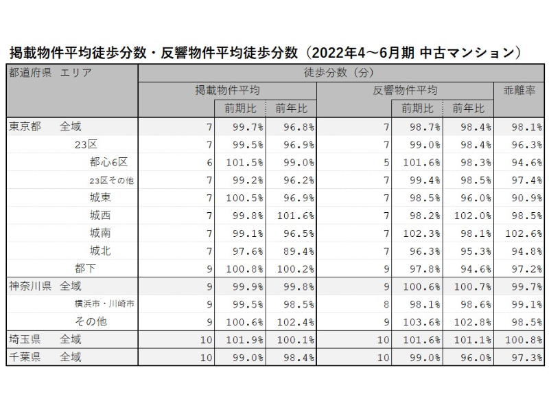 駅からの反響平均徒歩分数については、東京都が前年比98.4%、千葉県が前年比96.0%短縮傾向が見られた。神奈川県は前年比100.7%、埼玉県は前年比101.1%で微増となっている。