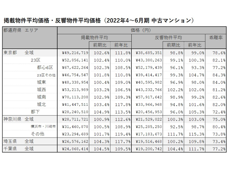 それに対し、反響物件平均価格は、東京都が3,868万5,351円で前年比99.0%、神奈川県が2,152万9,022円で同103.0%、埼玉県が1,951万6,468円で同109.8%、千葉県が1,920万742円で同111.7%だった。掲載物件平均価格と反響物件平均価格の差を示した乖離率(反響物件平均÷掲載物件平均)は、東京都が78.6%(前期は81.6%)、神奈川県が75.0%(同75.4%)、埼玉県が73.4%(同76.5%)、千葉県が77.2%(同77.2%)と、1都3県すべてにおいて前の3ヶ月よりも乖離が広がっている。