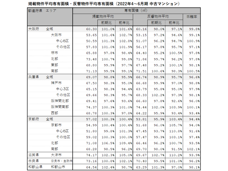 反響物件平均専有面積と掲載物件平均専有面積との乖離率(反響物件平均専有面積÷掲載平均専有面積)を見ると、大阪府が99.8%、兵庫県が96.6%、京都府が94.4%、滋賀県大津市が93.9%、奈良県奈良市・生駒市が96.2%、和歌山県和歌山市が98.1%であり、価格と比較すると専有面積の乖離は限定的となっている。
