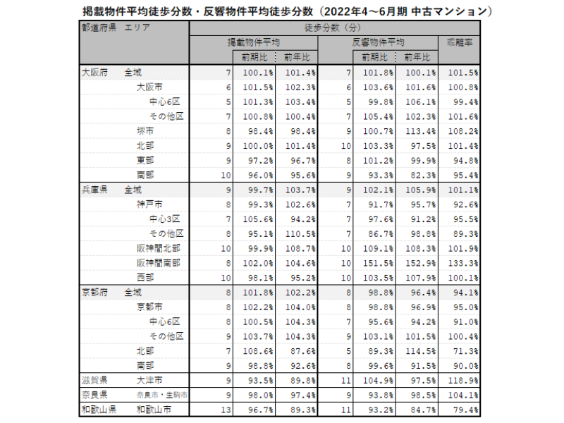 駅からの反響物件平均徒歩分数については、大阪府が対前年比100.1%、兵庫県が同105.9%と増加した一方、京都府が同96.4%、滋賀県大津市が同97.5%、奈良県奈良市・生駒市が同98.5%、和歌山県和歌山市が同84.7%と短縮が見られた。