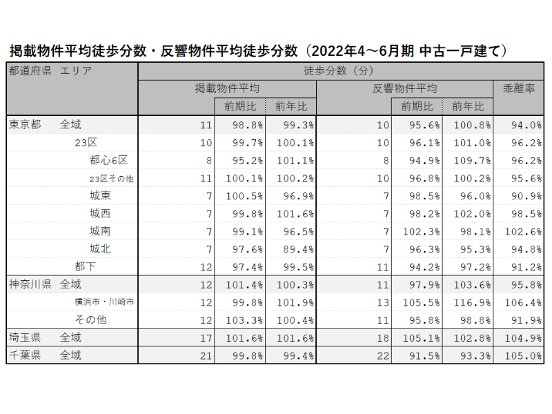 反響物件平均徒歩分数では東京都が掲載物件平均徒歩分数との乖離率94.0%、神奈川県が同95.8%と前年より徒歩分数の短い物件に反響が入る傾向が見られる一方、埼玉県では乖離率104.9%、千葉県では同105.0%と、前年より徒歩分数の長い物件に反響が入っている傾向がみられる。