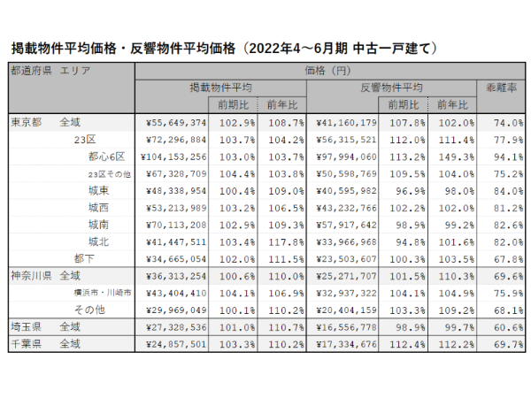 2022年4~6月期に、LIFULL HOME’Sに掲載された中古一戸建ての掲載物件の平均価格は、東京都が5,564万9,374円で前年比108.7%、神奈川県が3,631万3,254円で同110.0%、埼玉県が2,732万8,536円で同110.7%、千葉県が2,485万7,501円で同110.2%と、1都3県はいずれも前年比で約1割上昇した。