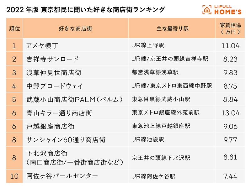 住まい探しをする際は、お気に入りの商店街を見つけたら、周辺の家賃相場をチェックしてみてはどうだろう。最後に、商店街好きが選んだ「最も好きな商店街トップ10」と併せて、主な最寄り駅の家賃相場をご紹介する。ほかにも住み替えで気になる駅がある人は、LIFULL HOME'S家賃相場を参照してみてほしい。