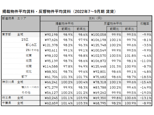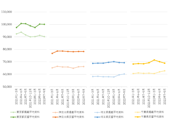 対する反響物件平均賃料も、直近1年はおおむね横ばい傾向にある。足元の2022年7~9月期では、東京都が10万58円で前期比99.9%、神奈川県が7万8,318円で同100.1%、埼玉県が6万9,350円で同99.8%、千葉県6万8,795円で同98.2%となっている。