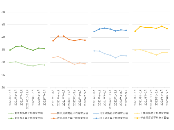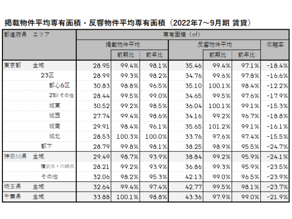 一方の反響平均専有面積は、直近1年ではほぼ横ばい傾向にある。2022年7~9月期においては、東京都が35.46m2で前期比99.4%、神奈川県が38.84m2で同99.2%、埼玉県が42.77m2で同99.5%、千葉県が43.36m2で同97.9%となった。