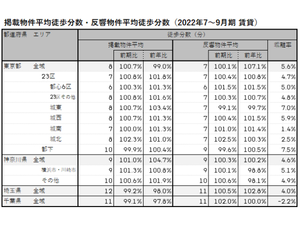 対する反響物件平均徒歩分数も横ばい傾向にあり、2022年7~9月期では、東京都が前期比100.1%、神奈川県が同100.3%、埼玉県が同100.5%、千葉県が同102.0%となった。