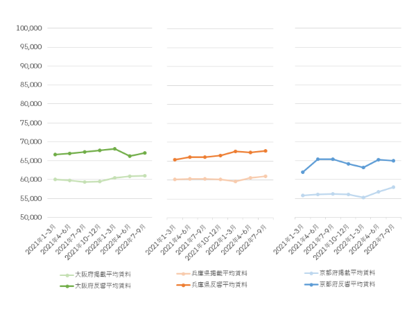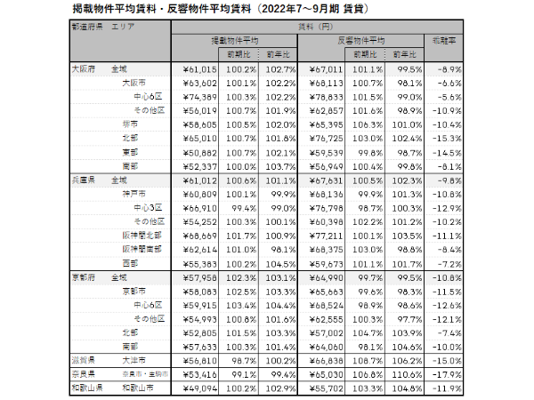 対する反響物件平均賃料も、直近1年ほぼ横ばい傾向にある。2022年7~9月期では、大阪府6万7,011円で前期比101.1%、兵庫県が6万7,631円で同100.5%、京都府が6万4,990円で同99.7%となっている。
