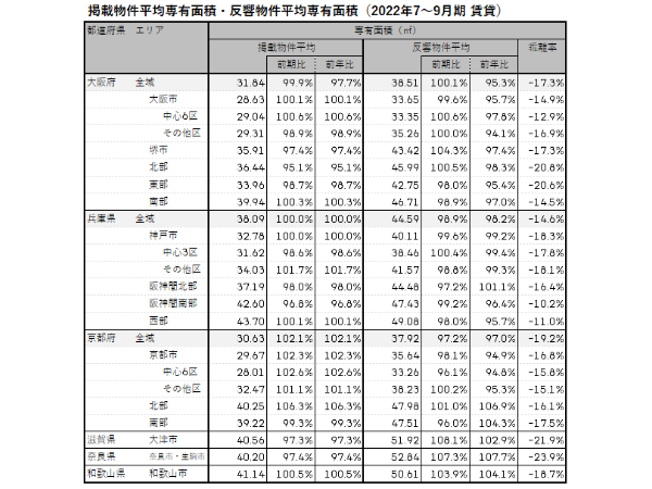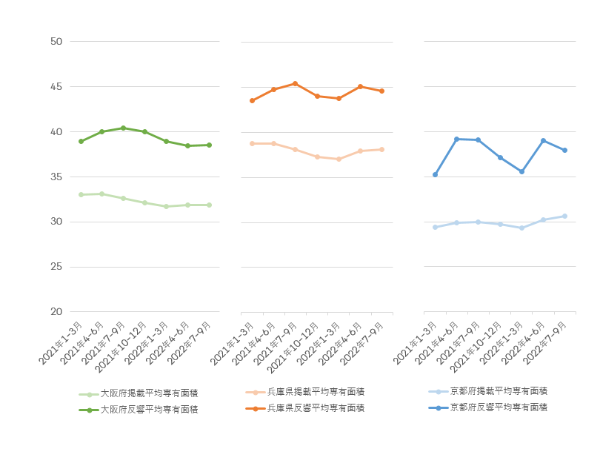 一方の反響平均専有面積も、上下動はあるものの直近1年はほぼ横ばい傾向にある。2022年7~9月期においては、大阪府が38.51m2で前期比100.1%、兵庫県が44.59m2で同98.9%、京都府が37.92m2で同97.2%となった。