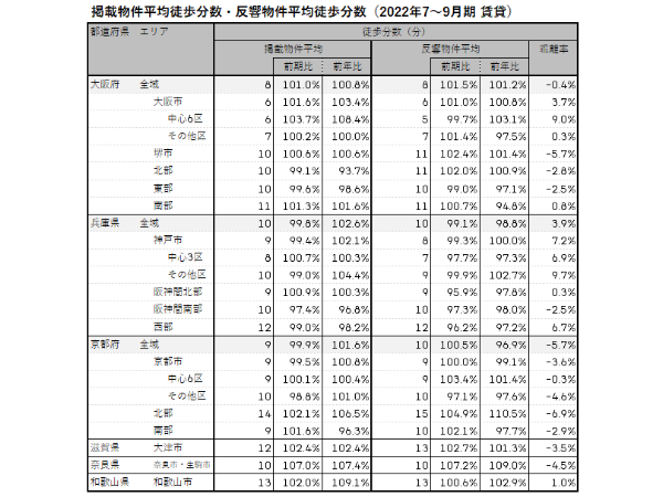 対する反響物件平均徒歩分数も横ばい傾向にあり、2022年7~9月期では、大阪府が前期比101.5%、兵庫県が同99.1%、京都府が同100.5%となり、足元でも横ばい傾向となった。