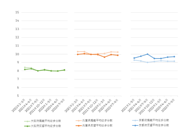 2府1県の直近1年の掲載物件平均徒歩分数は、いずれも横ばい傾向にある。2022年7~9月期では、大阪府が前期比101.0%、兵庫県が同99.8%、京都府が同99.9%だった。
