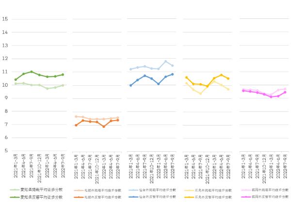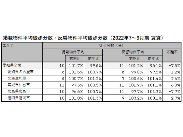 愛知県全域および地方4市では、掲載物件平均徒歩分数はここ1年上下動がありながらも横ばい傾向で推移している。足元の2022年7~9月期ではエリアによって異なるものの、前期比96~101%台となった。