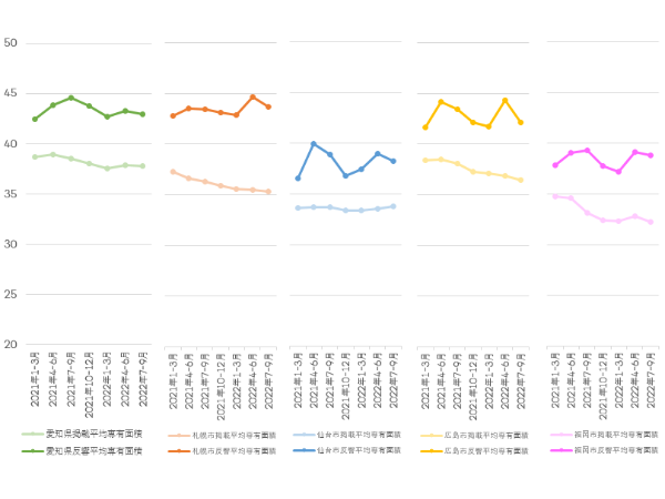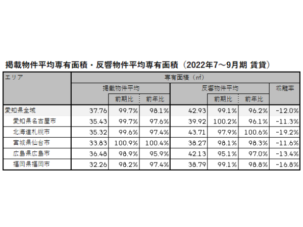 一方の反響平均専有面積は、上下動はあるものの直近1年はほぼ横ばい傾向にある。2022年7~9月期においては、愛知県全域が42.93m2で前期比99.1%、札幌市が43.71m2で同97.9%、仙台市が38.27m2で同98.1%、広島市が42.13m2で同95.1%、福岡市が38.79m2で同99.1%となり、いずれも縮小した。