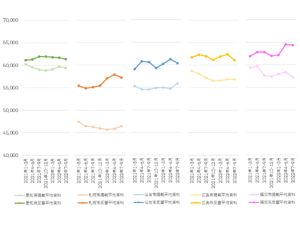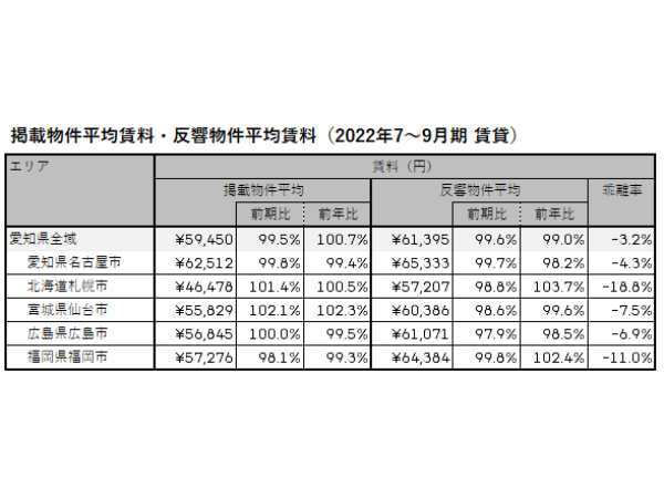対する直近1年の反響物件平均賃料は、札幌市と福岡市でやや上昇基調にある。2022年7~9月期では, 愛知県全域が6万1,395円で前期比99.6%、札幌市が5万7,207円で同98.8%、仙台市が6万386円で同98.6%、広島市が6万1.071円で同97.9%、福岡市が6万4,384円で同99.8%と、足元ではいずれもわずかに下落したが、札幌市と福岡市は前年比でそれぞれ103.7%と102.4%と、前年同期の水準を上回っている。
