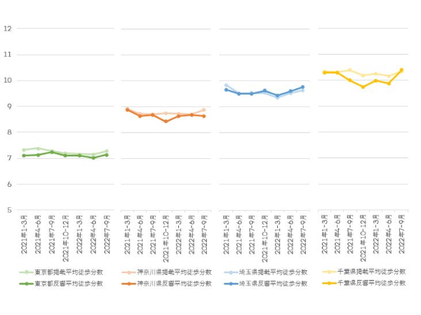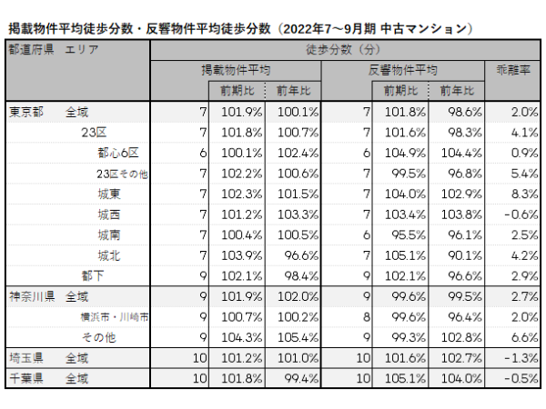 駅からの徒歩分数は掲載物件平均、反響物件平均ともに横ばい傾向で大きな動きは見られない。足元の2022年7~9月では、千葉県の反響平均徒歩分数が前期比105.1%、前年比104.0%と増加した。