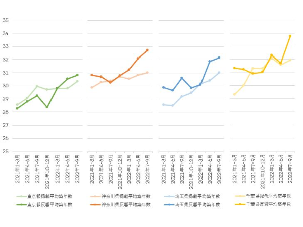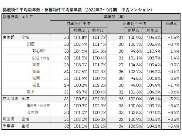 直近1年の平均築年数は、掲載物件、反響物件ともに1都3県すべてで増加傾向にある。2022年7~9月期の掲載平均築年数は、東京都が前年比101.2%、神奈川県が同102.0%、埼玉県が同106.3%、千葉県が同102.1%となり、前期比でもそれぞれ100~102%台と増加。反響平均築年数は、東京都が前年比105.4%、神奈川県が同108.1%、埼玉県が同105.1%、千葉県が同109.2%、前期比でも100~106%台となり、掲載平均築年数以上の増加が見られる。