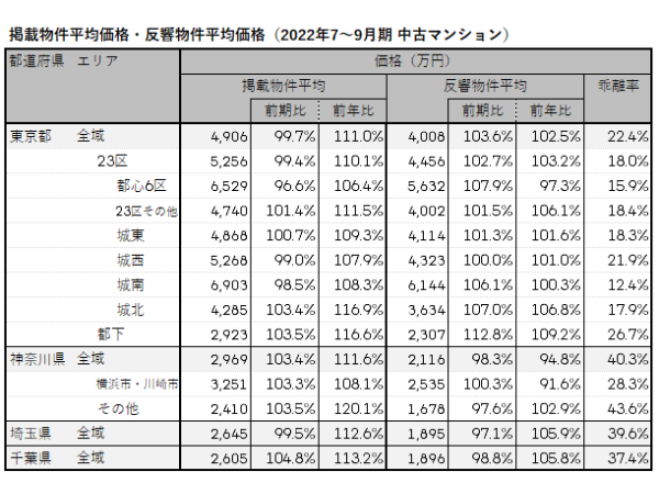 ※乖離率の計算式を前回(2022年4~6月期)までは「反響物件平均/掲載物件平均」で行っていたが、今回から変更し「(掲載物件平均-反響物件平均)/反響物件平均」としている