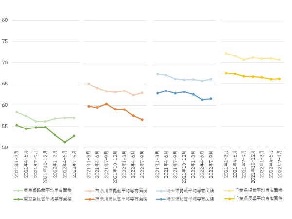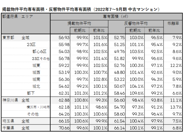足元の2022年7~9月の動向では、東京都が56.93m2で前期比99.9%、神奈川県が62.88m2で同100.8%、埼玉県が66.15m2で同100.6%、千葉県が70.66m2で同99.6%となった。