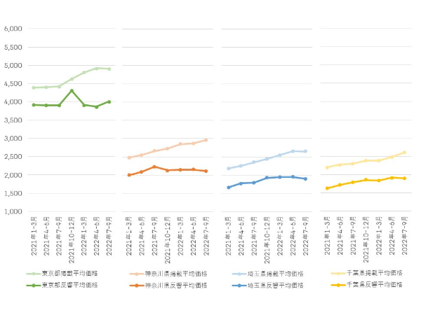 一方の反響物件平均価格は、直近1年でほぼ横ばいの傾向。足元の2022年7~9月期では、東京都だけが4,008万円で前期比103.6%とやや上昇が見られたものの、神奈川県は2,116万円で同98.3%、埼玉県は1,895万円で同97.1%、千葉県は1,896万円で同98.3%と下落している。