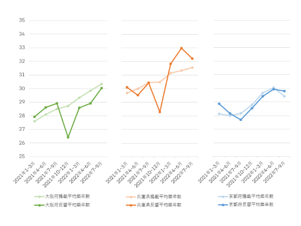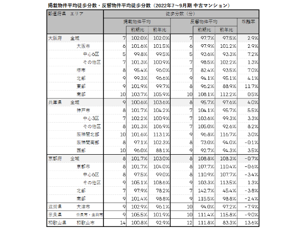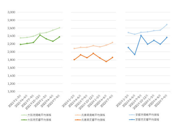 2府1県(大阪府、兵庫県、京都府)では直近1年の掲載物件平均価格がいずれも上昇傾向にあり、2022年7~9月期は、大阪府が2,606万円で前年比109.0%、兵庫県が2,239万円で同105.9%、京都府が2,682万円で同107.7%と、いずれも前年と比べて上昇している。足元の動向でも、大阪府が前期比102.5%、兵庫県が同103.2%と上昇が継続。なかでも京都府は前期のほぼ横ばいから今期は大きく上昇し、前期比105.6%となっている。