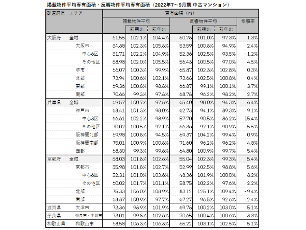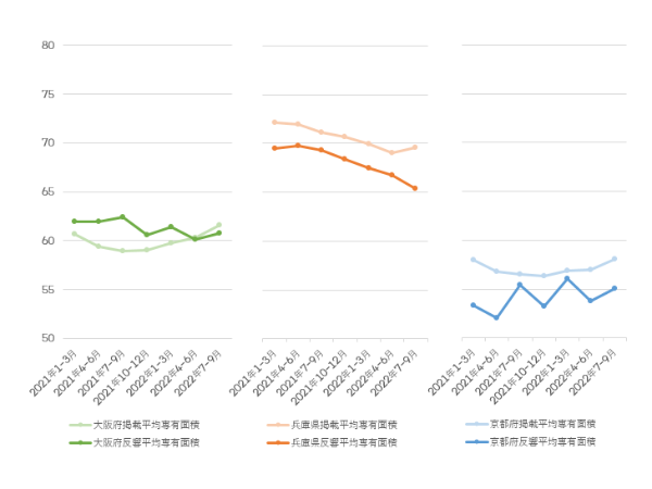 対する反響物件平均専有面積はここ1年、大阪府と京都府では横ばい傾向、兵庫県では掲載平均に比例して縮小が継続していた。2022年7~9月期においては、大阪府が60.78m2で前期比101.0%、兵庫県が65.40m2で同98.0%、京都府が55.04m2で同102.3%となり、兵庫県は引き続き縮小となった。前年比では、大阪府が97.3%、京都府が同99.3%、兵庫県が94.3%といずれも前年同期を下回っている。