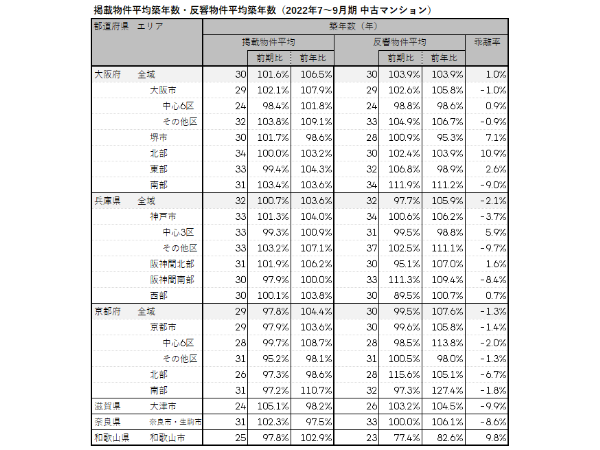 掲載物件平均築年数は、大阪府で前年比106.5%、兵庫県で同103.6%、京都府で同104.4%と増加傾向にある。前期比では、大阪府が101.6%、兵庫県が100.7%と引き続き増加しているが、京都府のみ97.8%とわずかに減少している。