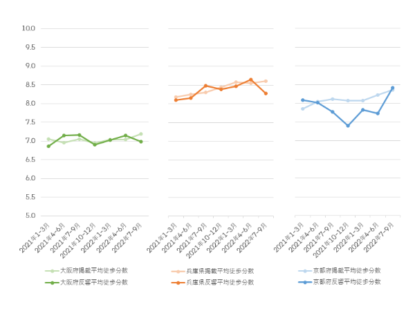 対する反響物件平均徒歩分数は、大阪府と兵庫県ではおおむね掲載平均徒歩分数と同様の動向となっている。京都府では反響平均徒歩分数の減少により、掲載平均徒歩分数との乖離が拡大していたが、2022年7~9月期は前期比108.8%と増加し、乖離がほぼなくなった。