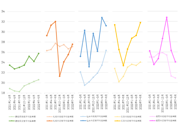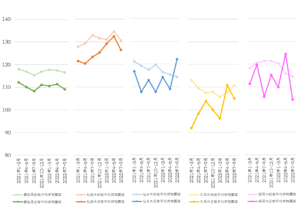 一方、直近1年の反響物件平均建物面積は、上下動はあるもののほぼ横ばい傾向といえそうだ。足元の2022年7~9月期では、愛知県全域が109.15m2で前期比98.0%、札幌市が126.41m2で同95.5%、仙台市が122.13m2で同112.0%、広島市が104.92m2で同94.7%、福岡市が104.35m2で同83.8%と、仙台市の拡大と福岡市の縮小が目立った。