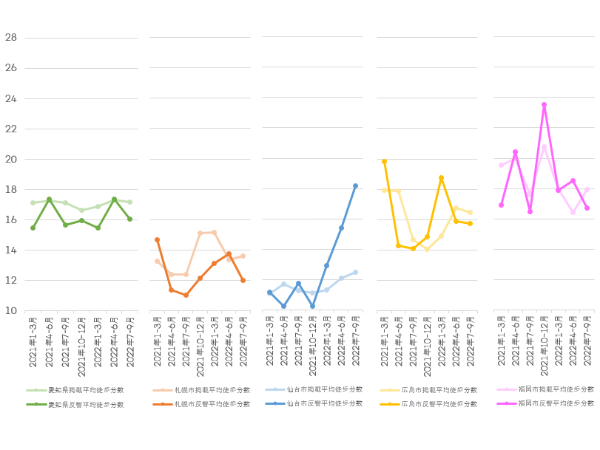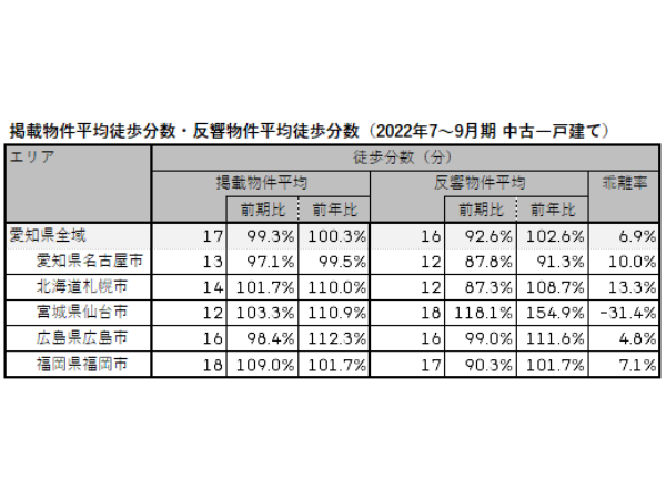 一方の反響物件平均徒歩分数は、上下動はあるものの直近1年は仙台市を除いて横ばい傾向にある。足元の2022年7~9月期では、仙台市が前期比118.1%、前年比154.9%と大幅な増加が継続している。